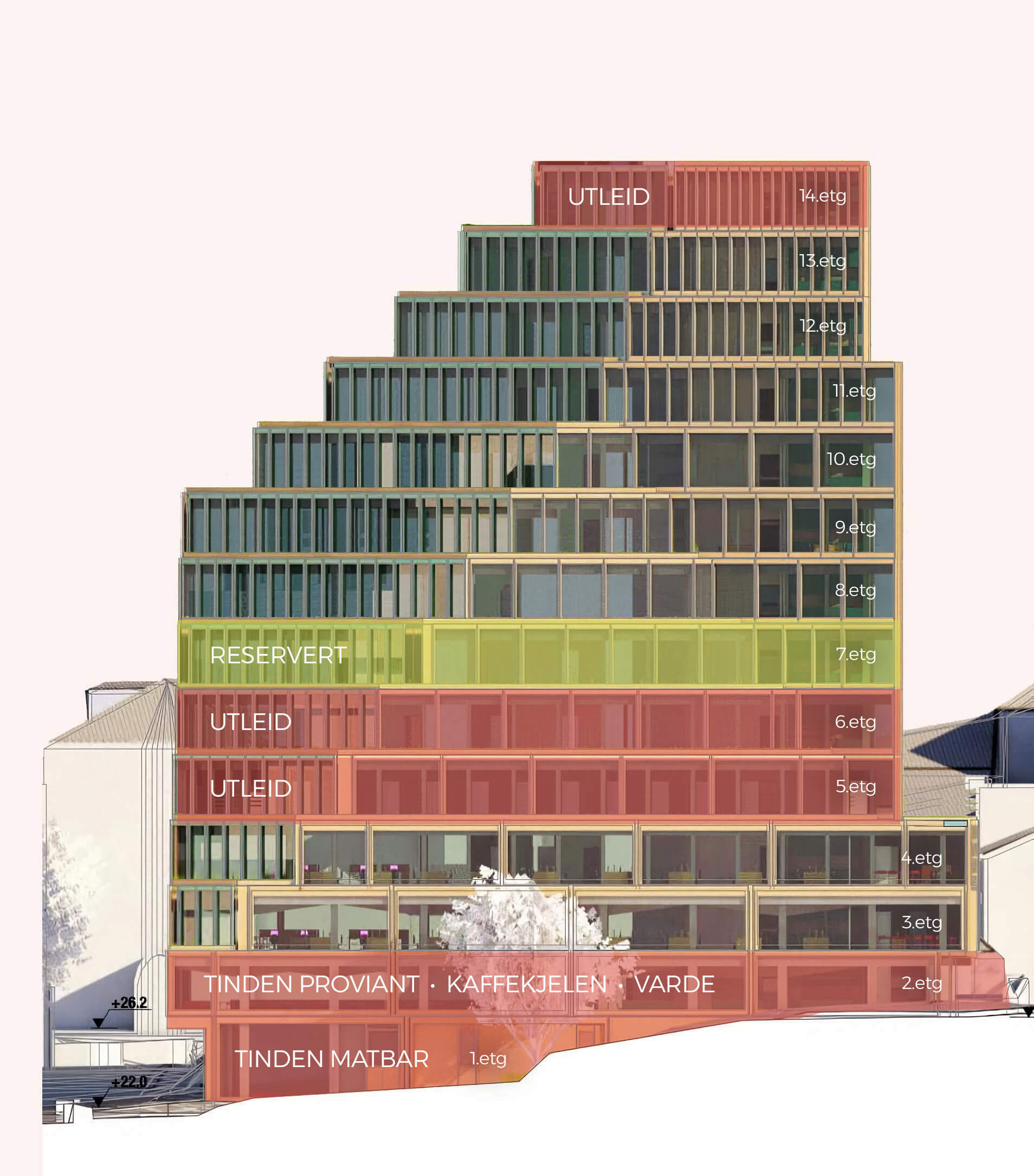 Med ledige etasjer tilpasset både små og store leietakere, er Tinden et naturlig samlingspunkt for bedrifter som ønsker å kombinere kvalitet, synlighet og nærhet til byens pulserende næringsliv. Her får du ikke bare kontorplass, men en del av et fellesskap der innovasjon, trivsel og vekst går hånd i hånd.